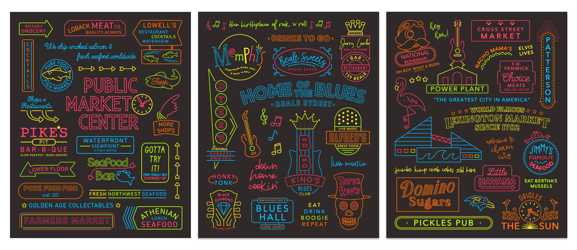 Dozens of shops thrifted, several bookstores browsed, and a gallon of clam chowder chowed down, I finally set off on the relaxing 22-hour1 train ride back home. Amtrak’s lousy WiFi became a forced digital detox, and I found myself doodling recreations of those Pike Place neon signs I was so obsessed with. Without much thought, I fired off a few sketches to some native Seattleite friends, and they nearly fell out of their chairs begging me to turn it into a poster.