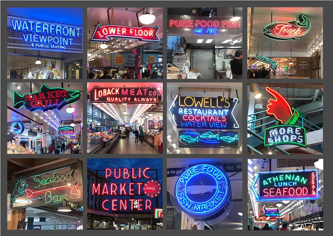 Once I got past the scent of raw fish that slapped me across the face upon stepping inside, I was instantly hypnotized by the countless neon signs which line the halls of the market. It was a quintessential wet, gray, Pacific Northwest morning, so these signs really seemed to jump off the walls.